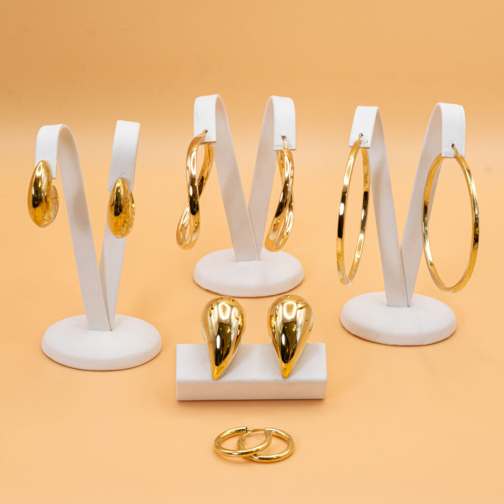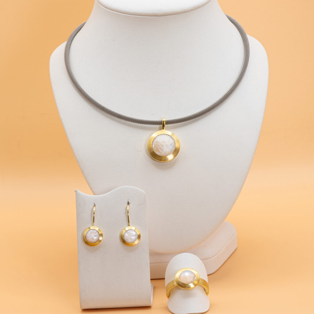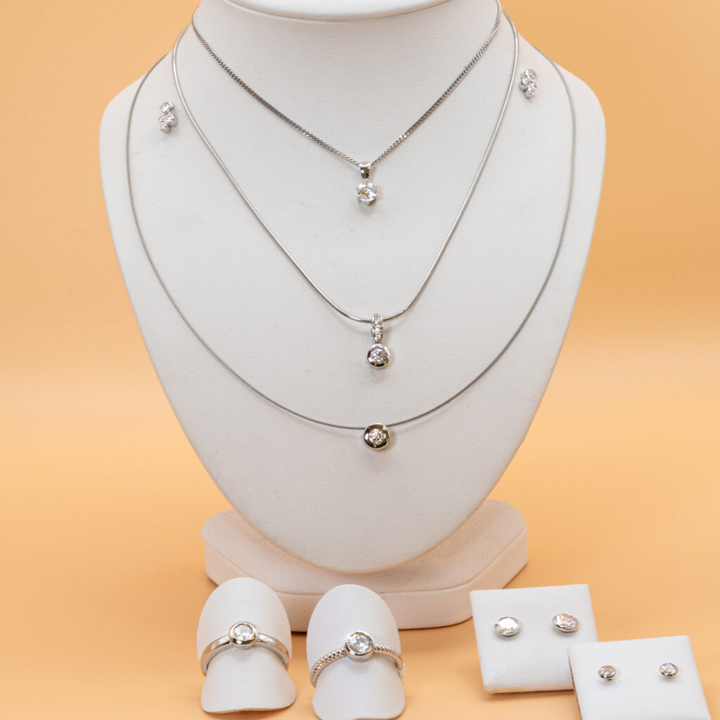 Schmuck aus Silber, Silber vergoldet, Edelstahl und auch eine kleine Kollektion aus 333 Gold erweitern das Angebot.